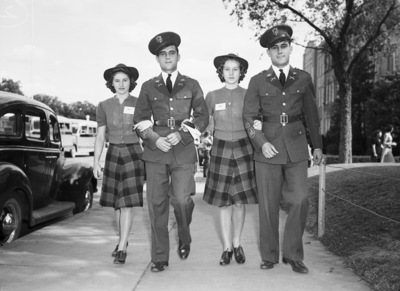 The Future Homemakers of Area 4 are meeting in Arlington, Texas. Pictured are two sets of twins, they are left to right Genette Hicks, Warren Seay, Genelle Hicks, and Harold Seay. The Hicks twins are Future Homemakers from Whitewright, Texas. Genette and Genelle are wearing matching outfits consisting of a hat, short-sleeve sweater, and a plaid skirt. Their escorts, the Seay twins, of Nocona, Texas, are students at North Texas Agricultural College. Warren and Harold are dressed in military uniforms. An automobile is parked at the curb as the group strolls down the street with linked arms. Published in the Fort Worth Star-Telegram morning edition, October 27, 1940.