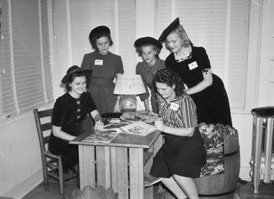 The Future Homemakers of Area 4 are meeting in Arlington, Texas. The executive council is looking over a homemaking magazine for timely tips. They are left to right Blanche Patrick, Hannah Duke, Francine Baxter, Mary Jo Saint Clair, and Victoria Leslie, seated. Miss Patrick, of Weatherford, Texas is the president of the organization. She is wearing a hat and a velvet dress with buttons down the front. Miss Duke, of Arlington, Texas, is the treasurer. She is wearing a hat and a dress. Miss Baxter, of Denton, Texas, is the reporter. He is wearing a hat and a striped dress. Miss Saint Clair, of Mineral Wells, Texas, is the parliamentarian. She is wearing a hat and a dress with lace around the collar. Miss Leslie, of Denton, Texas is the vice president. She is dressed in a striped blouse and a skirt. Published in the Fort Worth Star-Telegram morning edition, October 27, 1940.