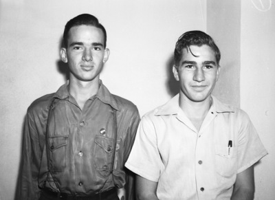 Fifteen Riverside High School students are charter members of the chess club which was recently organized under the sponsorship of Mrs. Alberta Cunningham, a science teacher. Officers of the club include Cliff Whitehead (left), president, and Gerald Richardson, reporter. Cliff Whitehead is wearing a long-sleeve shirt and suspenders; Gerald Richardson is wearing a collared shirt and he has a pen in his left breast pocket. They are standing next to each other against a plain wall. Published in the Fort Worth Star-Telegram morning edition, October 27, 1940.