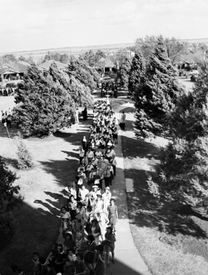 Feast Day celebration of Christ, The King. Catholics celebrating the Feast of Christ, the King, on the Our Lady of Victory Campus. Image is of a large walk of unidentified students, clergymen and school staff towards the church.(no clipping)