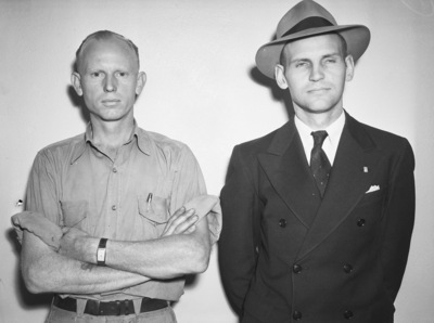 Men from Tarrant County, Texas, that were called to the draft, left to right, Harry Dwight Oakley Junior, from Forest Hill, Texas, and Robert Dundas Waggener, from Fort Worth, Texas. Mr. Oakley is wearing a shirt with the sleeves are rolled up and he is crossing his arms. Mr. Waggener is wearing a black suit, collared shirt, a polka-dot tie and a hat. Published in the Fort Worth Star-Telegram evening edition, October 29, 1940.