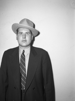 Harold Houston Edwards, of Fort Worth, Texas, is one of several men from Tarrant County, Texas, who were called in the draft. Mr. Edwards is wearing a suit, a striped tie, and a hat. He is standing in front of a wall. Published in the Fort Worth Star-Telegram evening edition, October 29, 1940.