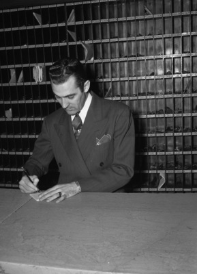 Ross Howard Dinkins was one of several men from Tarrant County, Texas, who were called to the draft. He is shown working behind the front desk at Hotel Texas. He is wearing a suit.