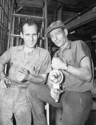 Personalities in the local draft news Tuesday because theirs were among the first numbers drawn from the historic goldfish bowl in Washington, D.C. Tarrant County men whose numbers were called in the draft shown here in the picture are, Sam Joyl Jones (left) was the first Area 2 whose number was drawn and Tomas David Jones (right), was the second. Though no kin at all, they have the same name, come from the same town in Oklahoma, work for the same company and were transferred to Fort Worth the same day. Mr. Jones is wearing a a coverall and Mr. David Jones is carrying a rivet gun. Published in the Fort Worth Star-Telegram morning edition, October 30, 1940.
