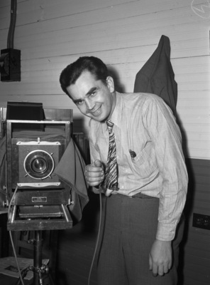Personalities in the local draft news Tuesday because theirs were among the first numbers drawn from the historic goldfish bowl in Washington, D.C. Among the Tarrant County men whose numbers were called in the draft shown here is Charles Gregory Johnston, 32, of Arlington, Texas (Area 8), the ninth in the selective service lottery. Mr. Johnson is posing with his camera with hand on the shutter, and he is wearing a long sleeve shirt, a patterned tie, and pants. Published in the Fort Worth Star-Telegram morning edition, October 30, 1940.