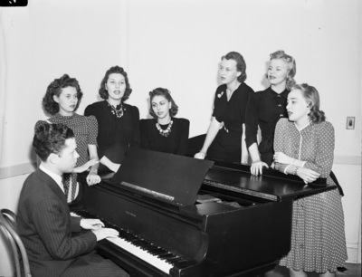 Texas Wesleyan College. Special Texas Wesleyan College Day program at Justice Chamber of Commerce luncheon. Left to right, Misses Marilyn Crabtree, Janice Sorrels, Lynell Benton. Faustine Howard, Betty Lou Foster and Nancy Jo Nolte. The director, Donald W. Bellah is at the piano. All the ladies are seen around he piano singing along.