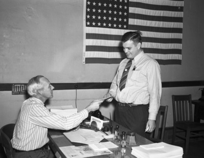 Don Wesley Wynne, is the son of a North Side pharmacist who also is chairman of the Selective Service Advisory Board for Area No. 5. Mr. Wynne is shown receiving from Clerk Arch Parnum a draft questionnaire after he had signed up as Tarrant County's first registrant volunteer. Given Order No. 5310 in the national lottery, Area No. 5 officials estimated it would be more that a year before he would be drafted, so he is taking the short route. Mr. Wynne is wearing a stripped collared shirt, pants, and a stripped tie. Mr. Parnum is seated at his desk wearing a stripped collared shirt and there is an American flag hanging on the wall. Published in the Fort Worth Star-Telegram evening edition, October 31, 1940.