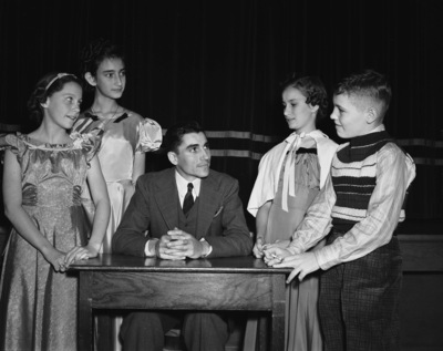 A Goodbye for the Teacher -- Officers of the high sixth grade of Oakhurst Elementary School stopped by their teacher's desk to say goodbye Thursday night before going to the auditorium for their promotion exercises. Left to right are Sarah Ellis, vice president; Patsy Landrum, president; Ralph Payne, teacher (seated); Barbara Smith, secretary, and Bill Agerton, treasurer. The class next week will enter Riverside Junior High School. The school children are standing around their teacher, who is sitting at a desk. The girls are wearing dresses and Bill is wearing a collared shirt, sweater and trousers. Mr. Payne is wearing a suit. Published in The Fort Worth Star-Telegram evening edition, January 19, 1940.