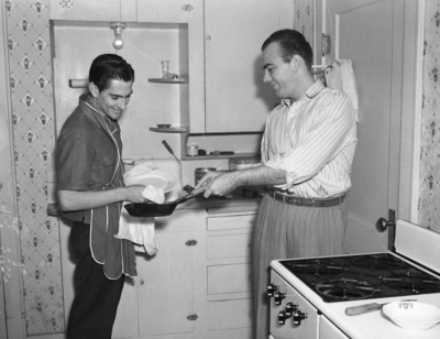 This domestic scene in an apartment near the Texas Christian University campus is not just a pose but a picture of Clarence Easter, left, and Bill Caudle, TCU juniors, busy about the housekeeping duties that become a daily routine with them as a part of their plan to get through school economically. They are both in their kitchen, Mr. Caudle is seen to be holding a pan and Mr. Easter is drying dishes using dish towel. Published in the Fort Worth Star-Telegram evening edition, November 5, 1940.
