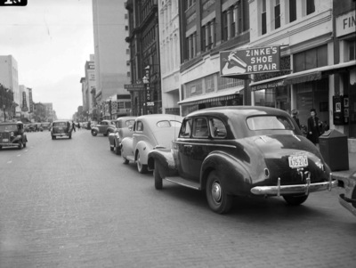 Looking south on Houston Street in Fort Worth, Texas, are cars coming up and down the street.