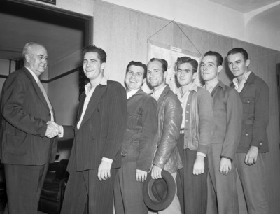 The six men present in the picture are from Tarrant County and they all volunteered to be drafted. The six are Riverside High School buddies and appeared en masse at the Draft Board 4 office Thursday. Here, they are getting a welcome from W. O. DeWees the board clerck. From left to right, Sam Marlin, Tom Winders, Elmo Lawson, John McClain, Bill Roberts, and Lloyd Blevins. The men are standing in line with Mr. Marlin shaking hands with Mr. DeWees. Published in the Fort Worth Star-Telegram morning edition, November 1, 1940.