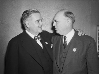Texas Mid-Continent Oil and Gas Association convention attendees George A. Hill Junior, left, of Houston, president of the Houston Oil Company and vice president, division of production, American Petroleum Institute. He is enjoying a visit with Roy B. Jones, president, Panhandle Producing and Refining Company of Wichita Falls, The men are embracing and and conversing. Published in The Fort Worth Star-Telegram Morning Edition November 01, 1940.