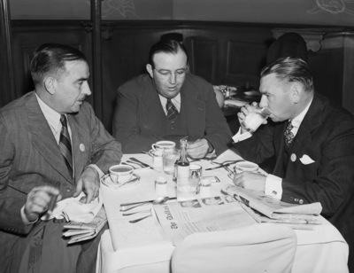 Early arrivals to the Texas Mid-Continent Oil and Gas Association were convention attendees John M. House, Midland, Texas; George P. Livermore, Fort Worth, Texas and Odessa, Texas oil man, and H. J. Kimler, Midland, Texas. All the men are seated at a table drinking coffee and engaged in conversation. Published in The Fort Worth Star-Telegram Evening Edition October 31, 1940.