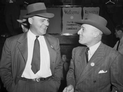 Early arrivals to the Texas Mid-Continent Oil and Gas Association convention were attendees Paul W. Pitzer Junior and Paul W. Pitzer Senior of Breckenridge, Texas. Shown are father and son talking and laughing. Published in The Fort Worth Star-Telegram Evening Edition October 31, 1940.