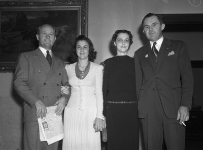 Texas Mid-Continent Oil and Gas Association convention cocktail party and dinner dance attendees at the Fort Worth Club include (left to right) Mr. and Mrs. Horace Young, Houston, Texas, and Mr. and Mrs. H. R. Stasney, Albany, Texas. Both couples are shown posed and wearing formal attire. Published in The Fort Worth Star-Telegram Morning Edition November 03, 1940.