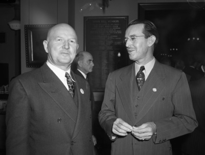 Texas Mid-Continent Oil and Gas Association convention cocktail party and dinner dance attendees at the Fort Worth Club include John B. Carter, Houston, Texas, left, and Fred W. Shield, San Antonio, Texas. Both men are dressed in formal attire and engaging in conversation. Published in The Fort Worth Star-Telegram Morning Edition November 03, 1940.
