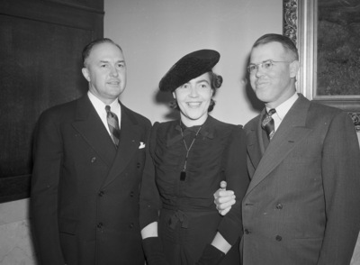 Texas Mid-Continent Oil and Gas Association convention cocktail party and dinner dance attendees at the Fort Worth Club include, J. C. Karcher, Dallas, Texas, left, and Mr. and Mrs. Joe Morris of San Antonio, Texas. All three are posed and shown wearing formal attire. Mrs. Morris is in the middle of the trio. Mr. Morris has his hand on his wife's arm. Published in The Fort Worth Star-Telegram Morning Edition November 03, 1940.