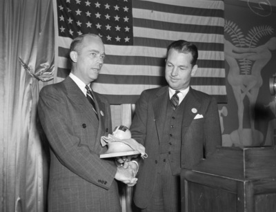 Members of the Texas Mid-Continent Oil and Gas Association paid tribute at the closing session of the association's 21st annual convention for the distinguished service of some members. Photograph of John G. Pew, left, Sun Oil Company, Dallas as he makes the award presentation to Jake L. Hamon, Dallas, selected as the independent operator having performed the most distinguished service during the year. Published in The Fort Worth Star-Telegram Morning Edition November 02, 1940.