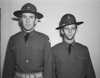Officers in Troops A and B, One Hundred Twenty-fourth Cavalry, Texas National Guard, whose promotions were announced. Shown here are left to right, Second Lieutenant William Wood, Troop B. and Second Lieutenant Jerrol Lowe. Both men are wearing their officer uniforms. Published in The Fort Worth Star-Telegram Evening Edition November 01, 1940.