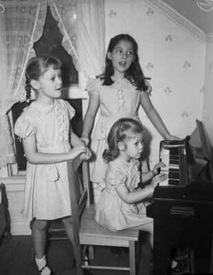 Gathering around the piano inside their playhouse are, left to right, Miranda, 6, Mary, 8, and Martha, 3. They are the daughters of Mr. and Mrs. Marvin Leonard. They are wearing matching frilly dresses. Martha is sitting at the piano and the other two girls are singing.