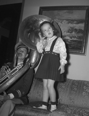 Howard Payne rooters here for the Texas Wesleyan College (T.W.C -Yellow Jacket football game. Shown here is June Ann Sewell, four year old daughter of Mr. and Mrs. William H. Sewell, Brownwood, Texas as she listens to Robert Nevans play the bass horn. Mr. Nevans is wearing a band uniform and hat and sitting on a couch playing the horn while Sewell stands on the couch with her ear to the bell of the horn and her right hand to her ear. Sewell is wearing skirt and a long-sleeved shirt with a ribbon pinned to it. A painting hangs behind them. Star-Telegram Morning, November 3 1940.