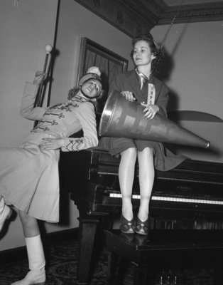 Howard Payne rooters here for the Texas Wesleyan College (T. W. C.)-Yellow Jacket football game. Shown here are Left to right, Drum Majorette Daphyne Cox, Grand Falls, Texas and Frances Avinger, Brownwood, Texas. Cox is wearing a a marching band uniform, including a hat with a feather in the bill, holding a baton and leaning against a piano. Avinger is wearing a dress with a ribbon attached to the lapel and holding a megaphone while sitting on the piano. Star-Telegram Morning, November 3 1940.