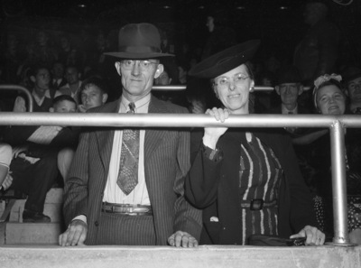 Texas Wesleyan College (T. W. C.) vs. Howard Payne University football game spectators, Mr. and Mrs. Robert L. Dominy, Ram rooters from Handley, Texas. Mr. Dominy is wearing a suit, tie, hat, and glasses while Mrs. Dominy is wearing a dress, jacket, hat, and glasses. They are standing behind a guardrail with a crowd of spectators sitting behind them Star-Telegram Morning, November 3 1940.