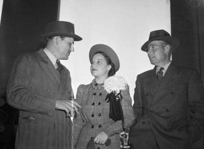 Texas Wesleyan College (T. W. C.) vs. Howard Payne University football game spectator Mrs. J. R. Stuart from Strawn, Texas. Mrs. Stuart is wearing a dress with a large flower pinned to the lapel and a hat. She is talking to two men on either side of her who are both wearing suits, ties and hats. Star-Telegram Morning, November 3 1940.