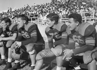 Baylor Bears vs Texas Christian University (TCU) football game. Baylor University Bears football players (left to right) Odell Griffin of Cleburne, Texas; U. A. Young of Waco, Texas; and Bobo Barnett of Livingston, Texas sitting on a bench during the game. They are all wearing uniforms with jerseys emblazoned with their individual numbers over their shoulder pads, padded pants and cleats, Young is also wearing glasses. A crowd of spectators fills the stands behind them. Star-Telegram Evening, November 6 1940.