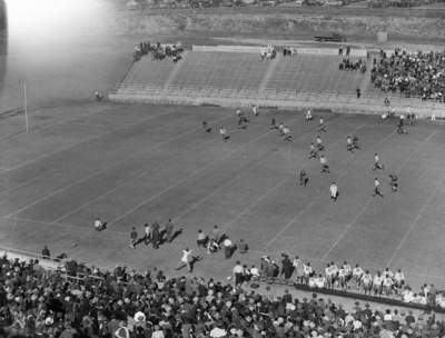 Texas Christian University (TCU) vs. Baylor University football game. Texas Christian University pulled off a unique play. The ball went to Frank Kring, he faked a hand-off to Kyle Gillespie who then veered off into the flats to his right. Kring then forward passed it to Connie Sparks on the right side of the field who lateraled it to Gillespie who took it up the right sideline for a touchdown. All of the players on the field are visible in this shot, along with two referees, all of whom are wearing their respective uniforms. Gillespie can be seen near the far sideline carrying the ball 12 yards away from the end zone with an opponent chasing close behind. At the bottom and top of the picture, spectators can be seen in the stands. Star-Telegram Morning, November 3 1940.