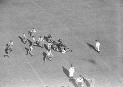 Texas Christian University (TCU) vs. Baylor University football game. Kyle Gillespie, who lies buried beneath a stack of Baylor Bears in the center of the picture, attempted a quick kick, but was blocked by his own player. Leonard Pugh, wearing number twenty-nine for Texas Christian University, recovered the loose ball; however, since the ball went past the line of scrimmage, Baylor gained possession. Most of the players on the field are visible in this shot, along with three referees; all of whom are wearing their respective uniforms. Star-Telegram Morning, November 5 1940.