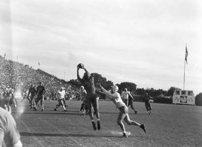 University of Texas (U. T.) and Southern Methodist University (S. M. U.) football game. Noble Doss, U. T., about to make a tackle and E. L. Keeton, S. M. U. catching the ball.