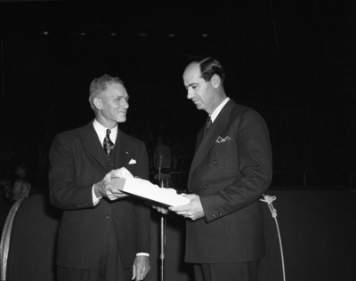 Dr. Ernest Rogers, left, president of the Optimist Club, presents President Law Sone of Texas Wesleyan College with a plaque at the T. W. C. Howard Payne football game at Farrington Field. Both are wearing suits and collared white shirts. Published in the Fort Worth Star-Telegram morning edition, November 3, 1940.