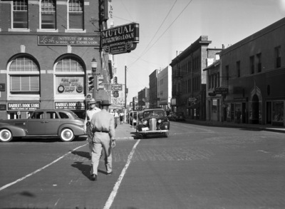 Street scenes in Fort Worth, Texas. People are seen crossing the street as cars are parked along the curb.