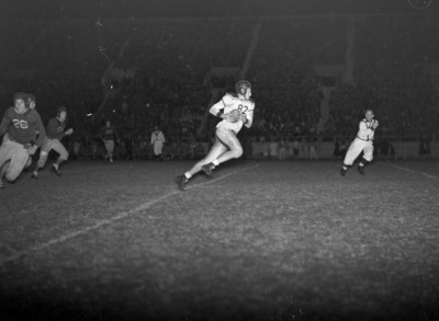 Texas Wesleyan College vs. Howard Payne College football game at Farrington Field.. Rowland Warren, Howard Payne College, number eighty two, with the ball after receiving a pass from Tommy Samuels. Warren is pictured wearing his full uniform with the number 82 on the jersey running down the field for what will be a touchdown. Three opposing players are chasing after Warren and a referee is running to the side of him. A crowd of people can be seen in the stands in the background. Star-Telegram Evening, November 4 1940