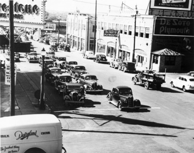 Looking west on West 7th Street from Henderson Street; Firestone building on left, 11/05/1940