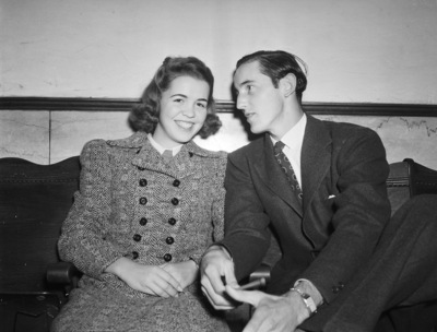 The school district is planning to abolish Greek Letter Organizations in Fort Worth High Schools. Heads of th..e regulatory bodies for high school fraternities and sororities are crowding outside the Ninety-Sixth District Courtroom. Testifying at an injunction hearing are, Barbara Jean Taylor and Jimmie Getz. Miss Taylor is a student at Texas Christian University and the head of the Inter-sorority Council. She is wearing a buttoned coat. Mr. Getz, is a bank clerk and president of the Inter-fraternity Council. He is dressed in a suit.