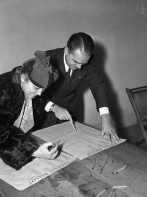 Tarrant County's citizens marched to the polls to join 50,000,000 other Americans in expressing a choice for President and Vice President and State, district and county officials. Throughout the county, scenes like these were common place. Shown here in the picture voting in the Tarrant County polls are Mr. and Mrs. R. Weldon Reed, they scratch two ballots at the Precinct 86 firehall. Published in the Fort Worth Star-Telegram evening edition, November 5, 1940.