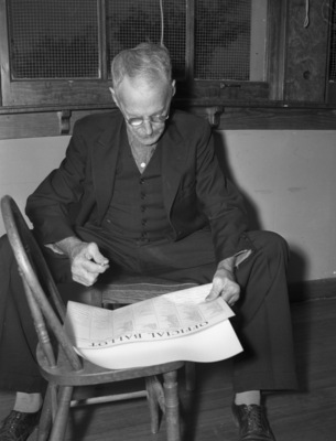 Tarrant County's citizens marched to the polls to join 50,000,000 other Americans in expressing a choice for President and Vice President and State, district and county officials. Throughout the county, scenes like these were common place. Shown here is W. L. Dean, at the Denver Avenue School. The paper he's seen to be holding has official ballot written on it. Published in the Fort Worth Star-Telegram evening edition, November 5, 1940.