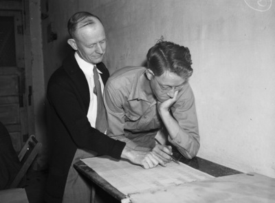 Tarrant County's citizens marched to the polls to join 50,000,000 other Americans in expressing a choice for President and Vice President and State, district and county officials. Throughout the county, scenes like these were common place. Shown are Roy Welch, election official and J. H. McCullars at the East Bessie Street election box. Published in the Fort Worth Star-Telegram evening edition, November 5, 1940.