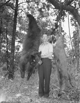 J. J. Gray, Fort Worth grocer, shown with 400 lb bear and 300 lb mule deer, which he brought back from a hunting trip into the El Capitan Mountains of New Mexico. He shot both animals alone and without either dog or horse. The picture showing both animals