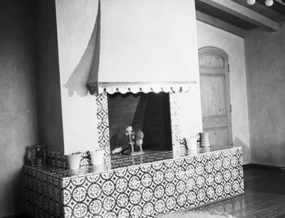 Interior fireplace in the new home of Mr. and Mrs. Jack Buckler in River View Estates, at 104 Hazelwood Drive. This is the informal Mexican room with a tiled fireplace two feet above the floor. The tile has a bold design forming a geometric pattern.
