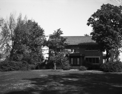 Pictured is the home of J. W. Frazier in Charleston, Illinois. The farmhouse is typical of those found in the Corn Belt. The two story farmhouse is shaded by tall trees and surrounded by shrubs. Mr. Frazier is raising cattle from the Swante M. Swenson (SMS) Ranches of Texas.