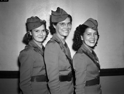 Reserve Officer's Training Corps (R. O. T. C.) sponsors at J. P. Elder Junior High School. Left to right, Wanda Box, company B; Pauline Hall, faculty sponsor; and Alice Hogue, Company A. They are standing next to each other side view. Published on November 12, 1940.