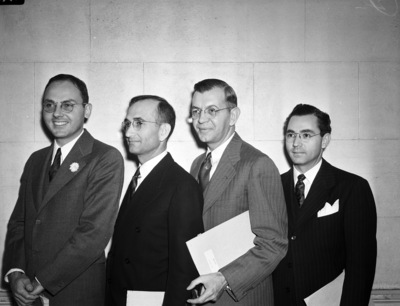 Members of high ranking units of the professional group, Community Chest campaign (left to right) are: Burton B. Paddock, group chairman, Clayton Orn, E.K. House and Dr. O. M. Phillips. They have raised $12,420 or 104 percent of their $12,000 quota. They stand next to each other, facing to the right in this half length portrait. Published in the Fort Worth Star-Telegram morning edition, December 1, 1940