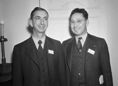 Texas' city tax assessors and collectors highlighted the sectional gatherings preceding the twenty-eighth convention of the League of Texas Municipalities at Hotel Texas. Shown here are, left to right, R. W. "Dick" Evans, Uvalde; and J. M. Darwood, Quanah City Secretary, Texas. Uvalde's R. W. "Dick" Evans finds himself in a peculiar position. He is the new president of the finance officers section and a member of the organization committe for the "rebels", the tax assessors and collectors. Both of them are wearing suits and ties and standing next to each other. Published in the Fort Worth Star-Telegram morning edition, November 7, 1940.