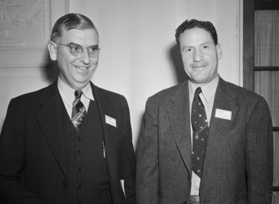 Texas' city tax assessors and collectors highlighted the sectional gatherings preceding the twenty-eighth convention of the League of Texas Municipalities at Hotel Texas. Left to right, City Attorney R. H. Ratliff of Colorado City, and Electra's city secretary E. W. Presson, Electra, Texas. City Attorney R. H. Ratliff is who told the finance officers about "Protection of Deposits and Federal Deposit Insurance Corporation Coverage". He is also a member of the town's band. Electra's city secretary E. W. Presson is the fellow who once was responsible for all those swell Electra High School track teams. Before turning to municipal duties three years ago, Presson coached the Tigers a number of years, winning district honors every year but one and putting so many boys in the state finals Electra won recognition as North Texas' outstanding cinder path school. Both men are wearing suits and standing next to each other. Published in the Fort Worth Star-Telegram morning edition, November 7, 1940.