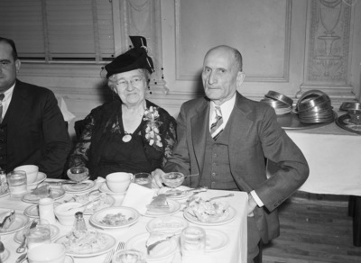 Riverside Civic League's eighth annual banquet at Hotel Texas. Shown here are Mr. and Mrs. T. P. Sprinkle, pioneers of the community. They're both seen to be sitting at the dining table. Mrs. Sprinkle is wearing a long sleeve dress and a hat and Mr. Sprinkle is wearing a suit, a collared shirt, and tie. Published in the Fort Worth Star-Telegram morning edition, November 7, 1940.