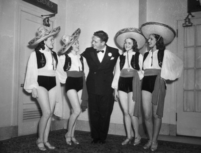 Russ Lamb, the new master of ceremonies for the "South American Revu" is pictured here with two armsful of beauties at Hotel Texas Den. The beautiful girls known as the Flashes, left to right, are Leeray Todd, Dorothy Murray, Billie Marie Warren and Dorothy Bryant. All five are dressed in uniforms. Published in the Fort Worth Star-Telegram evening edition, November 7, 1940.