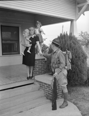 Texas National Guardsman Private Claude P. Morgan veteran member of Company B., 144th Infantry, bidding his wife and children, Patsy Gene, 5, and Claudia Ann, 19 months, goodbye. Mrs. Morgan is holding Claudia Ann in her arms while standing on the top steps of the house's porch. Private Morgan is wearing full uniform and holding a rifle and is extending his hand to hold his wife's. Patsy Gene stands on a pillar behind her mother. Published in the Fort Worth Star-Telegram Morning Edition, November 24 1940.